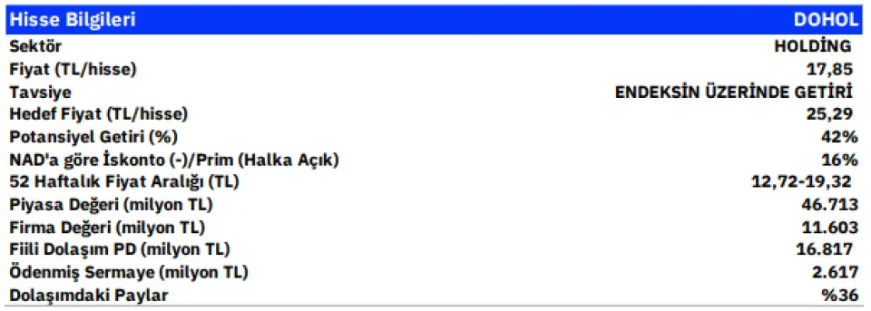 Gedik Yatırım en son yayınladığı raporda Doğan Holding DOHOL hissesi için hedef fiyat açıkladı. Kurum hisseye 25,29 TL hedef fiyat tespit ederek endeks üzeri getiri beklesiğini açıkladı. DOHOL borsada son günlerde 18 TL civarı fiyattan işlem görüyor. Gedik Yatırım hissede %42 kazanç beklentisi içinde.