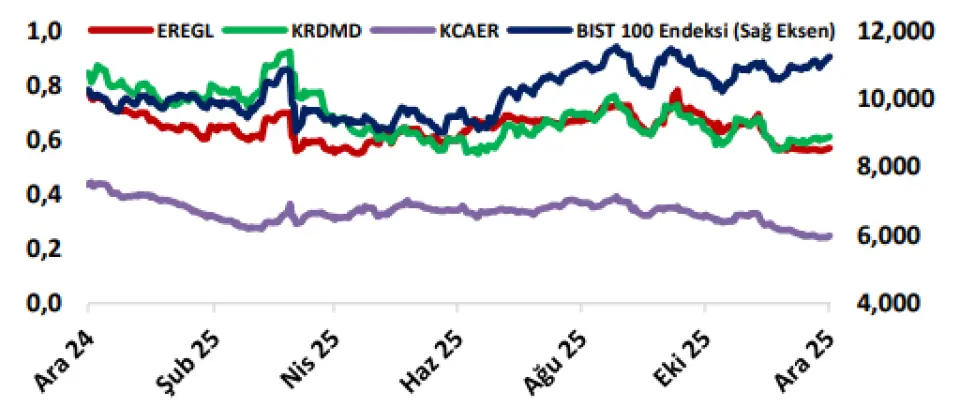 Son bir haftada EREGL, KRDMD ve KCAER sırasıyla %1,3, %1,1 ve %1,2 oranında değer kazandı. Yurt içinde fiyatlamalarda enflasyon ve faiz kararına yönelik beklentiler öne çıkarken, risk iştahı küresel piyasaların seyrine duyarlı kalmaya devam ediyor. Özellikle çelik fiyatlarındaki zayıf eğilim ve Çin kaynaklı talep görünümü, sektörde kısa vadeli volatiliteyi artırabilir; bununla birlikte kısa vadede hisse performanslarının daha çok yurt içi makro beklentiler doğrultusunda şekilleneceğini düşünüyoruz.