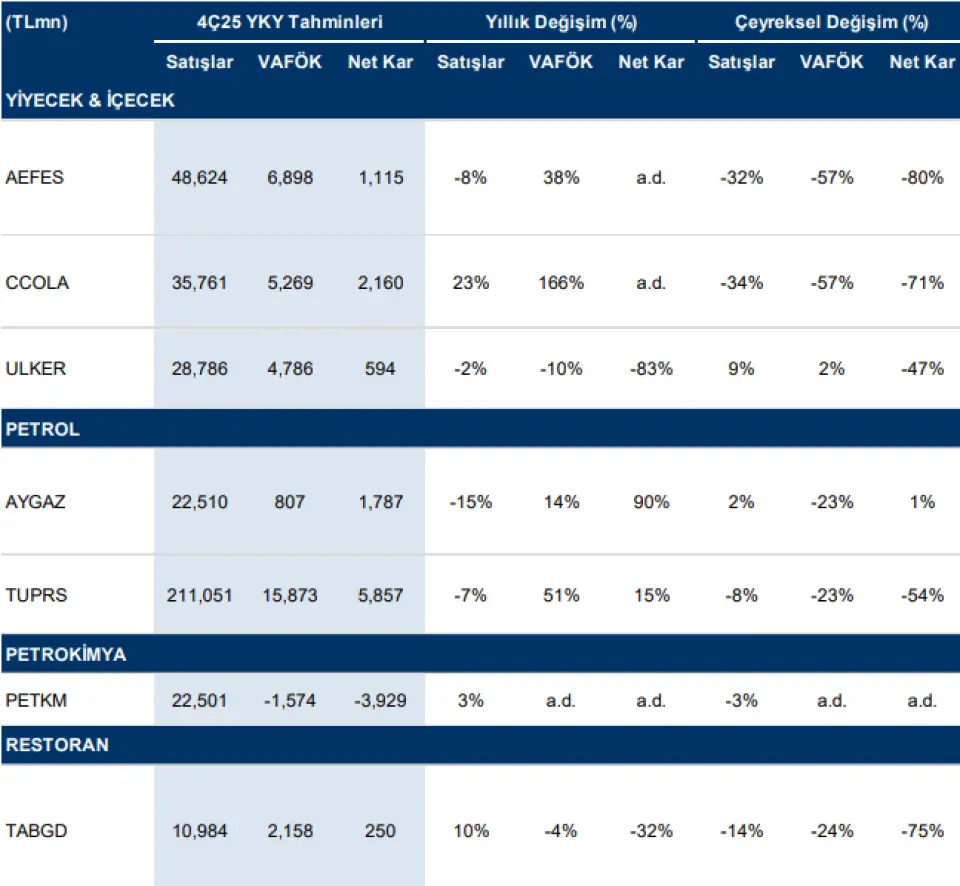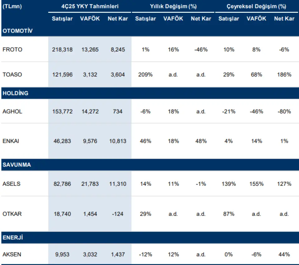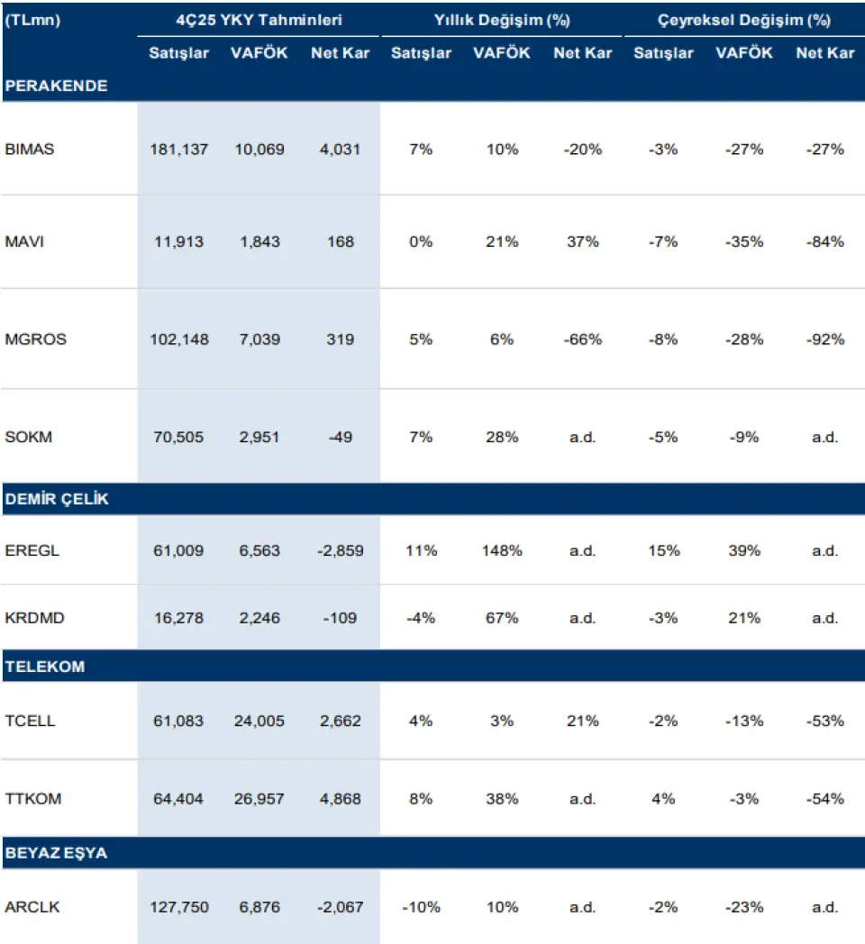 ■ Banka-Dışı Şirketler: 4Ç25’te inceleme kapsamımızdaki şirketlerin bir bütün olarak finansalları, yıllık ~%5 reel gelir artışı ve öncelikle düşük enerji ve personel maliyetleri ile azalan enflasyon baskıları sayesinde yıllık ~2 puanlık VAFÖK marjı iyileşmesine işaret etmektedir. Hem gelir hem de VAFÖK iyileşmesi beklerken, 4Ç25'teki net karlılığın önceki çeyreklere göre iki faktör tarafından daha fazla şekillendirileceğine inanıyoruz: (i) enflasyonun düşmesiyle birlikte etkisi azalan parasal kazanç / kayıp ve (ii) Vergi Usul Kanunu (VUK) kapsamındaki düzenlemelerden kaynaklanan ertelenmiş vergi giderleri. Daha sağlıklı VAFÖK marjlarına rağmen, özellikle muhasebe etkilerinin daha belirgin olduğu perakendeciler için ertelenmiş vergi giderlerinin net karı baskılamasını bekliyoruz. Tüketim sektöründe, maliyet azaltma girişimleri, personel giderlerindeki reel düşüş ve daha yüksek uluslararası hacim sayesinde CCOLA için reel büyüme ve marj iyileşmesi bekliyoruz. Benzer dinamikler SOKM, BIMAS ve MGROS için de geçerli fakat yüksek vergi giderlerinin karlılıkları baskılamasını tahmin ediyoruz. Ayrıca, ASELS, ENKAI ve AKSEN gibi güçlü bakiye siparişlere, ihracata yönelik faaliyetlere ve yapısal olarak yüksek VAFÖK marjlarına sahip şirketlerin öne çıkmasını bekliyoruz. Ayrıca, ~2 milyar TL'lik tazminata rağmen OTKAR'ın ve TOASO'nun düşük baz etkisi sayesinde güçlü büyümeler elde etmesini bekliyoruz. AYGAZ’ın, tek seferlik geliri ve TUPRS’ın güçlü ürün karlılıklarının da finansalları desteklemesini bekliyoruz. Olumsuz tarafta ise, AEFES ve AGHOL'ün ciro daralması; PETKM'in faaliyet zararı elde etmesi ve yüksek ertelenmiş vergi giderinin de net karı olumsuz etkilemesini bekliyoruz.