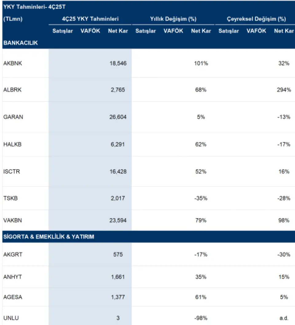 Banka & Sigorta & Yatırım – 4Ç25 Kar Tahminleri
