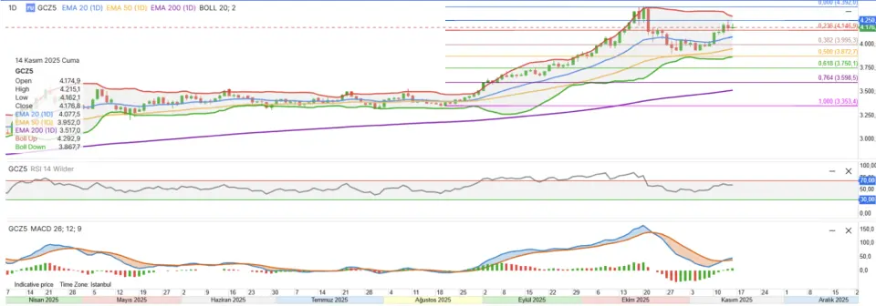 Hükümet kapanması nedeniyle bazı Ekim verilerinin hiç yayımlanmayabileceği açıklaması ekonomik görünümde temkin yarattı. Ancak Fed’in ek faiz indirimi konusunda isteksiz olması, Aralık indirimi ihtimalinin %95’ten %50’ye düşmesiyle altının yükselişini sınırladı. Teknik olarak, Altın fiyatı 4.170 dolar üzerinde tutunarak kısa vadede yükseliş trendini koruyor ve 4.250 dolar direncini yeniden test etme potansiyeli taşıyor.