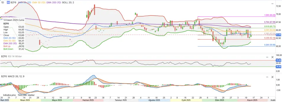 Teknik olarak Brent petrolde 63,60 bölgesi kısa vadede önemli destek olarak çalışırken, tepki alımları 64,50–65,00 Fibonacci %50 - %61,8 direnç bandında zorlanıyor. RSI nötr bölgede yatay seyrederken, MACD zayıf pozitif eğilim gösterse de henüz güçlü bir dönüş sinyali üretmiş değil. 62,80 altında kapanış gelirse düşüş yeniden hızlanabilir; 65,70 üzeri kırılım ise kısa vadeli yükselişi tetikleyebilir. Kısa vadeli teknik seviyeler olarak;
