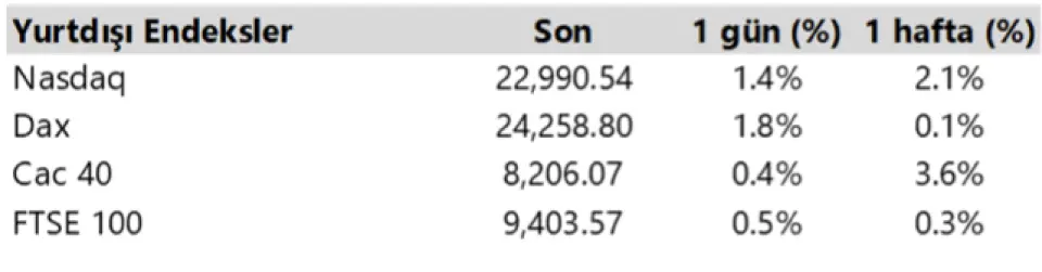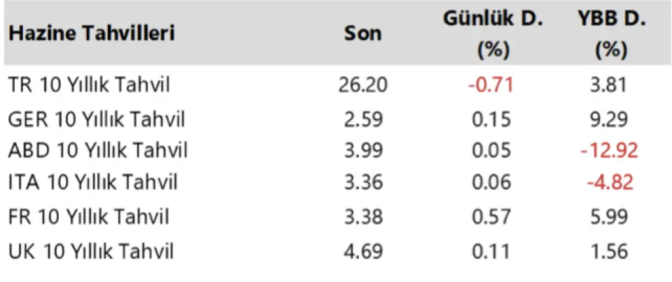 Almanya 10 yıllık tahvil faizi günü %2,589 seviyesinden kapanırken, İtalya 10 yıllık tahvil faizi ise günü %3,360 seviyesinden tamamladı. Fransa’da ise 10 yıllık tahvilin getirisi %3,381 oldu.