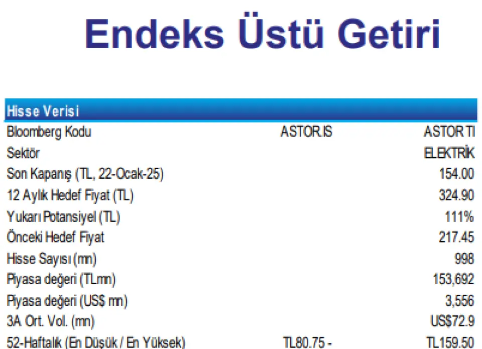 Astor Enerji’yi 01 Aralık 2025’te 90,60 TL fiyattan araştırma kapsamımıza alırken belirlediğimiz 217,45 TL hedef fiyatımızı 324,90 TL’ye yükseltiyor, endeks üzeri getiri tavsiyemizi koruyoruz. Değerleme tarafında, şirketin yeni bir yatırım dönemine girmesi nedeniyle daha önce kullandığımız %75 İndirgenmiş Nakit Akımı (DCF) + %25 benzer şirket çarpanları yaklaşımı yerine %100 DCF bazlı bir metodolojiye geçiyoruz. Yeni hedef fiyatımız, güncel hisse fiyatına göre yaklaşık %111 yükseliş potansiyeline işaret etmektedir.