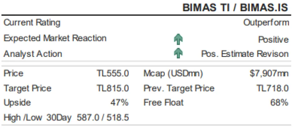 Hisse için “Üstün Getiri (Outperform)” tavsiyemizi 815 TL/hisse (önceki 718 TL) hedef fiyatla koruyoruz.