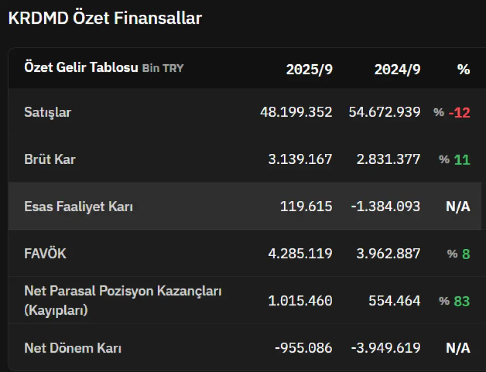 KRDMD bu yıl 3. çeyrek b,lançosunda umut vermişti. Şirket geçen yıl 3. çeyrekte 4 milyar Liraya yakın zarar açıklamıştı. Ancak n-bu yıl 3. çeyrekte zarar rakamı küçülmüş ve 955 milyon Lira zarar açıklanmıştı.