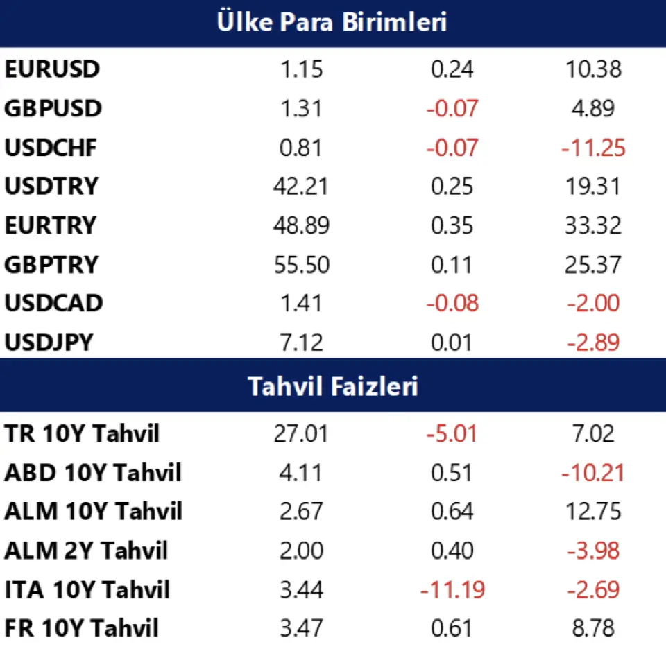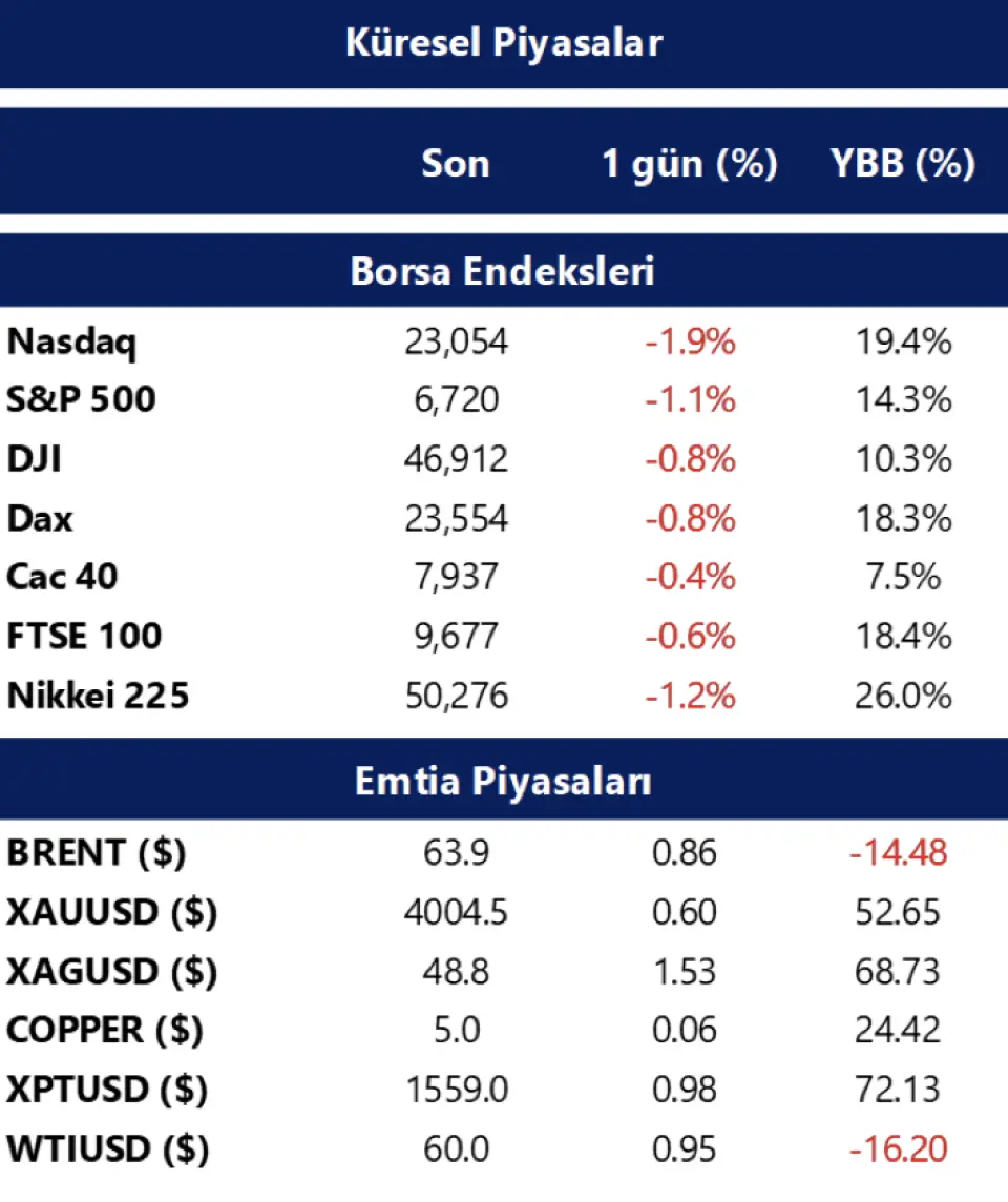 Öğle saatlerinde ABD vadelileri ve Avrupa borsaları negatif seyretti. Asya borsalarında da bugün itibariyle negatif bir görünüm hakim. Özetle küresel risk iştahı karışık seyrediyor. Emtia tarafında brent tipi ham petrol 63,9 $/varil civarında seyrederken, altının ons fiyatı 4.000 $ eşiğinde. Bitcoin 100.100 $, Ethereum ise 3.250 $ civarında işlem görüyor.