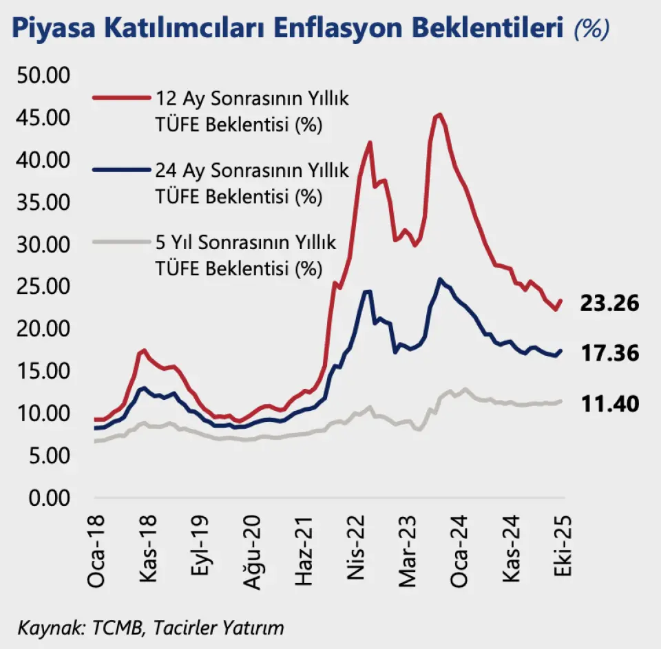 Bu çerçevede, katılımcıların 2025 yıl sonu TÜFE beklentisi ekim ayında %29,86 seviyesinden %31,77 seviyesine çıktı. Ek olarak, katılımcıların 12 ay sonrası TÜFE beklentisi %22,25’ten %23,26’ya, 24 ay sonrası TÜFE beklentisi ise %16,78’den %17,36’ya çıktı.