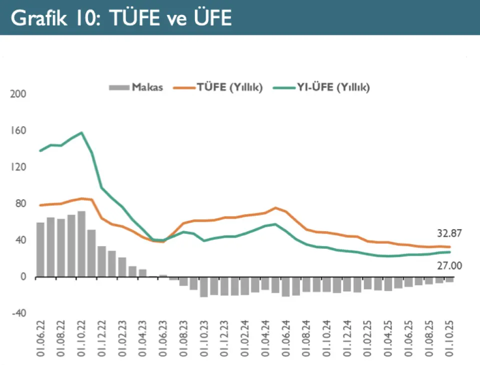 TÜİK verilerine göre Ekim 2025’te tüketici fiyat endeksi (TÜFE) beklentilerin altında aylık %2,55 artışla yıllık bazda %32,87 olarak gerçekleşti. Kuveyt Türk Yatırım Araştırma %2,76 ve konsensüs beklentileri aylık TÜFE’nin %2,71 artması yönündeydi. Çekirdek göstergelere bakıldığında, TÜFE (B) endeksi aylık %2,43 artışla yıllık %32,52’ye, TÜFE (C) endeksi ise aylık %2,41 artışla yıllık %32,05’e geriledi.