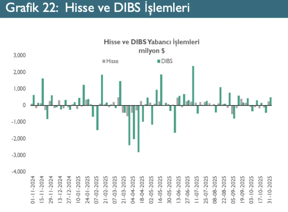 Türkiye Cumhuriyet Merkez Bankası (TCMB) verilerine göre, yurt dışı yerleşikler 31 Ekim haftasında hisse senedi piyasasında 243 milyon dolar, DİBS piyasasında ise 487 milyon dolarlık alım yaptı.