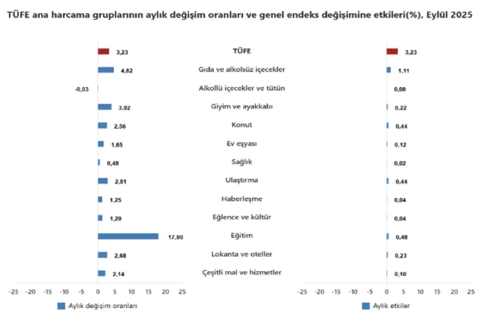 Artışı taşıyan dört grup: Gıda (+1,11), Eğitim (+0,48), Konut (+0,44), Ulaştırma (+0,44) birlikte aylık enflasyonun yaklaşık %76’sını oluşturuyor.