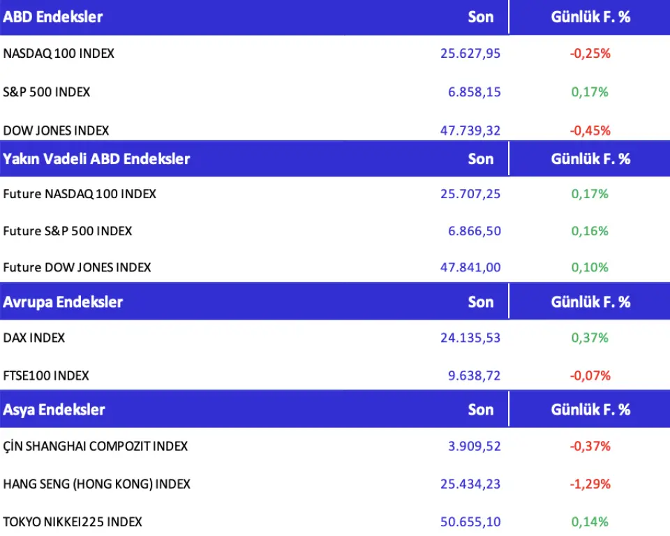 Bu ortamda ABD endekslerindeki dört günlük yükseliş serisi sona ererken, S&P 500 günü %0,4, Nasdaq 100 ise %0,3 düşüşle tamamladı; vadeli işlemler yatay kaldı. Öte yandan Trump'ın Nvidia'ya H200 çiplerini Çin'e ek %25 ücretle ihraç izni vermesi şirket hisselerini vadeli piyasada desteklerken, Çinli üreticiler baskı gördü; Japon tedarikçilerin hisseleri ise yükseldi. ABD 10 yıllık tahvil getirisi Asya işlemlerinde %4,174'e kadar çıkarak temkinli görünümü pekiştirdi.