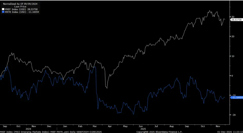 MSCI Türkiye endeksi (mavi seri) ile MSCI G.O.Ü endeksinin seyri (1Y)
