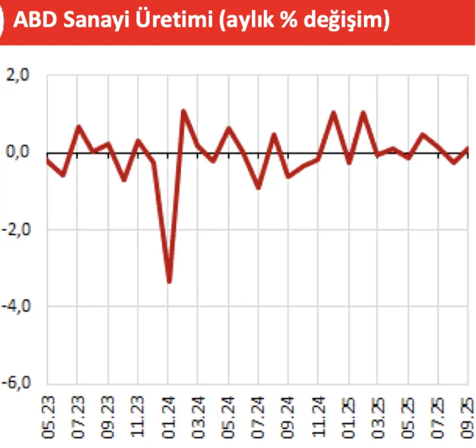 ABD’de sanayi üretimi, ağustos ayındaki aşağı yönlü revize edilen %0,3'lük düşüşün ardından eylülde %0,1 arttı. Eylül ayında enerji sektöründe artış görüldü. İmalat ve madencilik sektörleri ise bir önceki aya göre sabit kaldı. Kamu hizmetleri üretimi, bir önceki ayda %3'lük düşüşün ardından eylülde %1,1 arttı. Sanayi üretiminde yıllık artış ise %1,6 olarak gerçekleşti. Kapasite kullanım oranı da eylül ayında %75,9 ile yatay seyretti. İmalat sektöründe ise KKO ağustos ayında %75,6 iken eylülde %75,5 değerini aldı. Kasım ayında sanayi üretiminin sınırlı artacağı tahmin ediliyor.