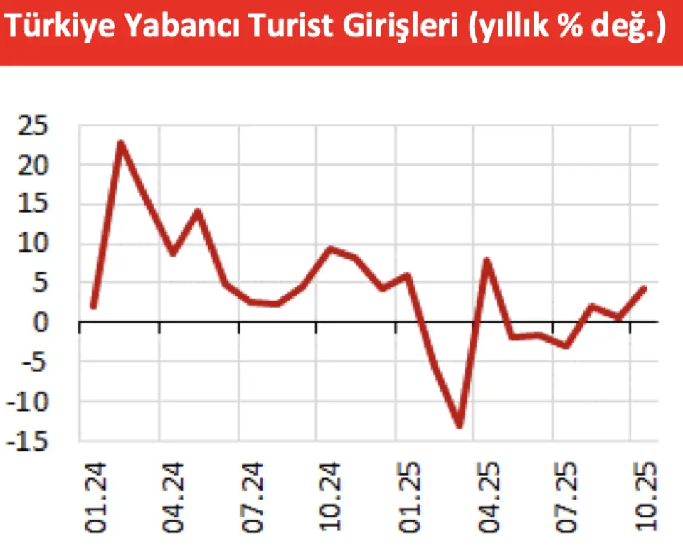 Kültür ve Turizm Bakanlığı verisine göre, yabancı turist sayısı ekim ayında yıllık %4,3 artarken, ocak-ekim döneminde bir önceki yılın aynı dönemine göre %0,1 azalarak 47,3 milyon kişi oldu. Milliyet kırılımında ilk beşte yer alan ülkelere göre; yılın ilk on aylık döneminde Rusya’dan gelen ziyaretçi sayısında yıllık artış %13,5 (6,4 milyon, pay: %13,5), Almanya’dan gelen ziyaretçi sayısında artış ise %13,1 (6,2 milyon, pay: %13,1) oldu. Bu ülkeleri İngiltere, İran ve Bulgaristan takip etti (paylar: %8,6, %5,4 ve %4,9).