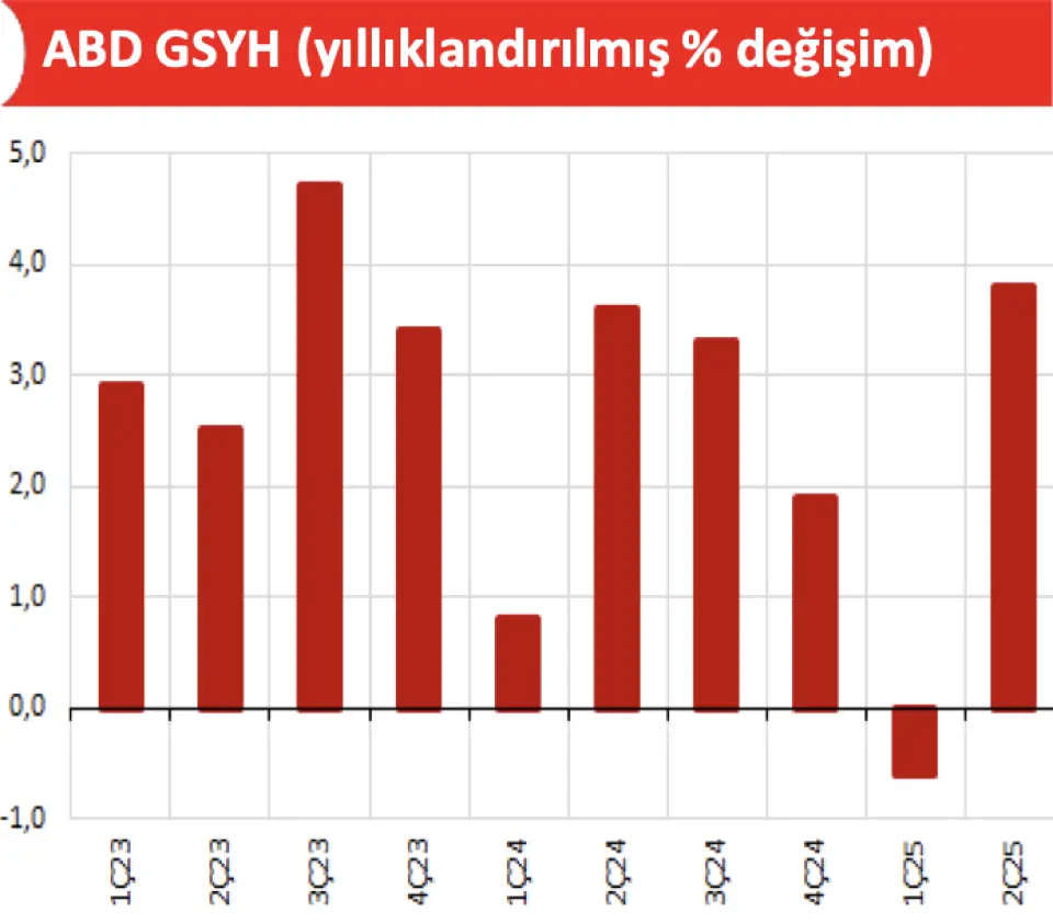 ABD ekonomisi ilk çeyrekte %0,6 daraldıktan sonra ikinci çeyrekte %3,8 büyüdü. İlk çeyrekte büyümeyi aşağı çeken ithalat ikinci çeyrekte +5 puan katkıda bulundu. Tüketim harcamaları, ikinci çeyrekte de büyümenin kaynağı olmaya devam etti; bu çeyrekte 1,7 puan katkı sağladı. Sabit yatırımlar büyümeye 0,8 puanlık katkı sağlarken, eyalet ve yerel yönetim harcamaları da büyümeyi destekledi. Stoklar ise büyümeye-3,4 puan ile olumsuz katkı sağladı. 3. çeyreğe ilişkin öncü veriler özellikle hizmetler sektörü kaynaklı güçlü seyrin sürdüğüne işaret ediyor. Ekonominin 3. çeyrekte yıllıklandırılmış olarak %3,2 büyüyeceği tahmin ediliyor.