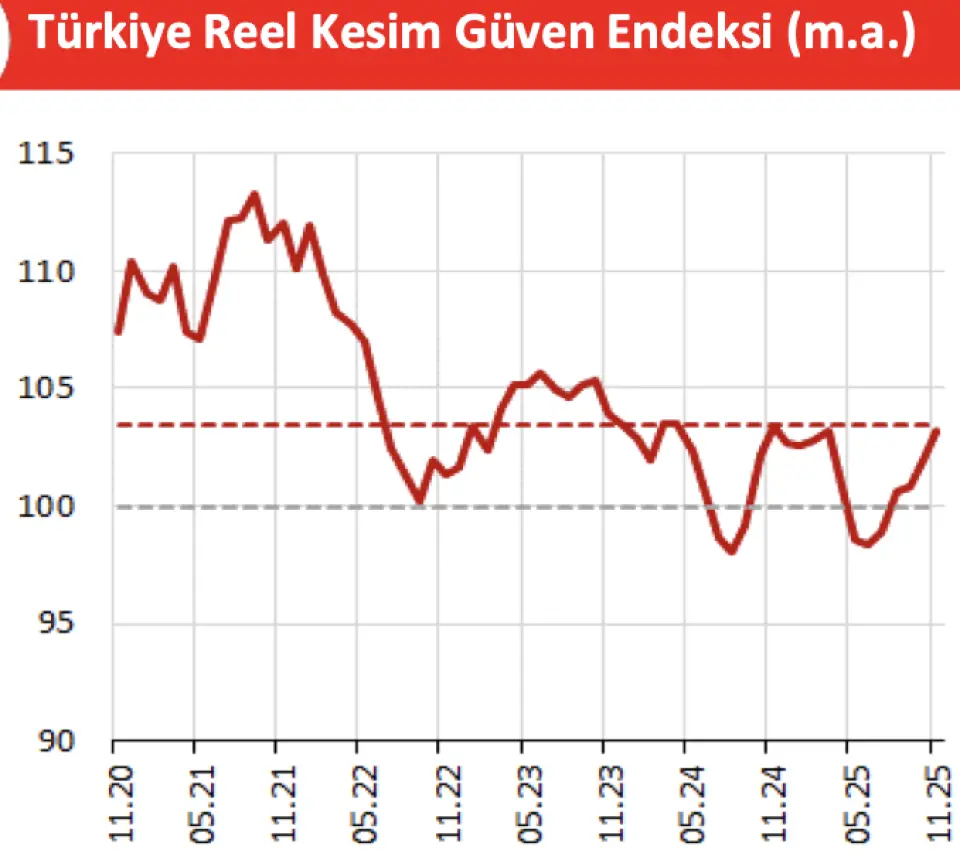 Reel Kesim Güven Endeksi kasım ayında mevsimsellikten arındırılmış (m.a) olarak aylık 1,2 puan daha artarak 103,2 ile Mart 2025’ten beri en yüksek değere ulaştı. Ayrıca endeks tarihsel ortalamasına oldukça yaklaşırken, imalat sanayinde de iyileşmeye başlayan bir görünüme işaret etti. Hizmet, perakende ve inşaat sektörlerinde de güven endeksi kasım ayında arttı ancak tarihsel ortalamalarının altındaki seyir sürdü. Kapasite Kullanım Oranı (m.a.) kasım ayında sınırlı artışla %74,1 oldu. KKO, tarihsel ortalamasının 2,2 puan altında kalarak üretimde zayıf seyrin yılın son çeyreğinde de devam ettiğine işaret etti.