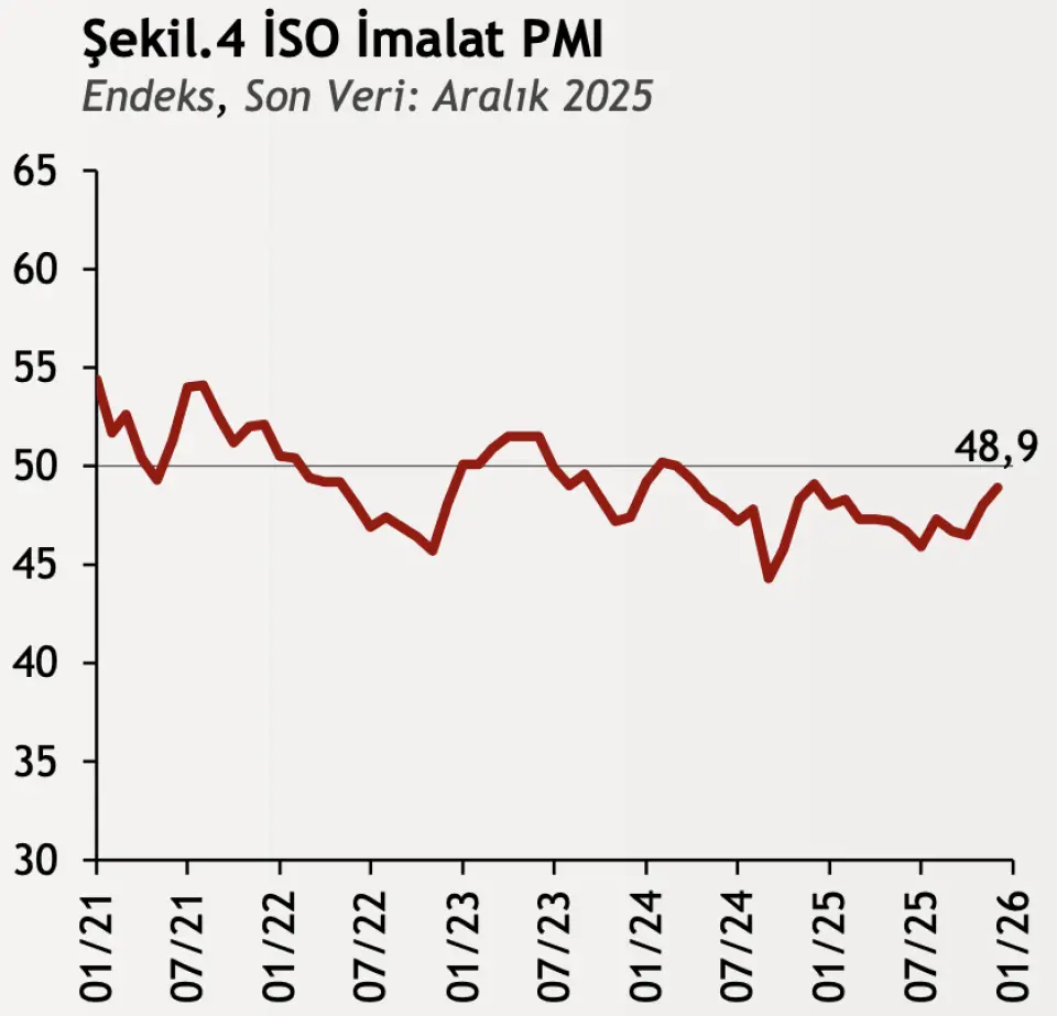 Aralık 2025’te İSO Türkiye İmalat PMI endeksi Kasımdaki 48,0 seviyesinden 48,9’a yükselerek yılın son ayında faaliyet koşullarındaki bozulmanın son 12 ayın en hafif düzeyinde gerçekleştiğine işaret etti. Üretim üst üste 21. ayda gerilemesine rağmen düşüş Kasım’a göre daha sınırlı kaldı. Yeni siparişlerdeki yavaşlama Mart 2024’ten bu yana en düşük seviyeye inerken ihracat siparişleri daha olumlu bir tablo çizdi. İstihdam daralması da hız keserek beş sektörde artış gösterdi.