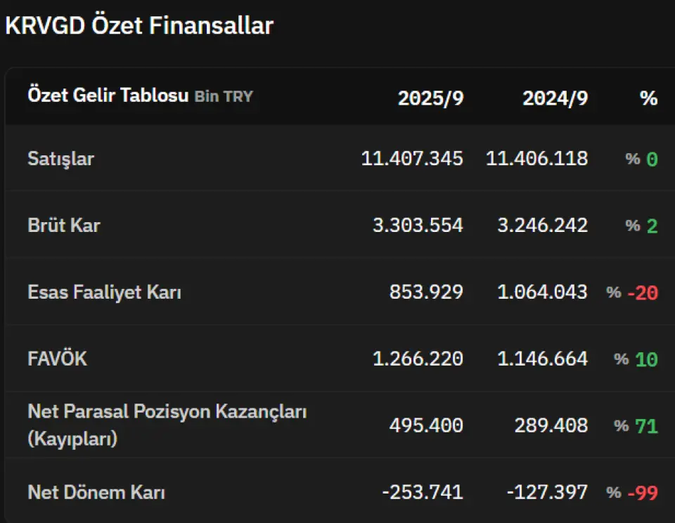 KRVGD geçen yıl 3. çeyrekte 127,397.000 TL zarar açıklamıştı. Şirket bu yıl 3. çeyrekte zarar rakamını 253,741.000 TL ye çıkarttı. Garanti BBVA Yatırım şirketin finansal tablolarını değerlendirdi. Kurum sonuçta zarar rakamının artmasına rağmen, bilanço dönemi sonrası EBRD ile imzalanan 40 milyon Avro tutarındaki uzun vadeli kredi anlaşması, kısa vadeli borçların çevrilmesini sağlayarak şirketin likidite pozisyonunu güçlendireceği açıklaması olumlu bir kanı yarattı.