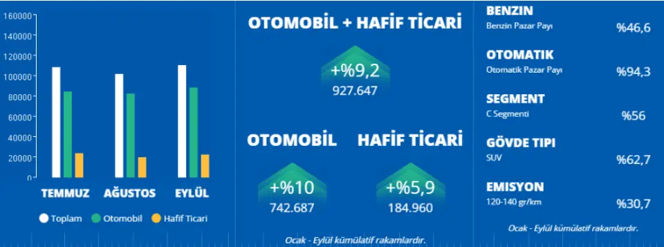 Türkiye otomobil ve hafif ticari araç toplam pazarı, 2025 yılı Ocak-Eylül döneminde bir önceki yılın aynı dönemine göre %9,15 oranında artarak 927.647 adet olarak gerçekleşti. Otomobil satışları, 2025 yılı Ocak-Eylül döneminde geçen yıla göre %9,98 oranında artarak 742.687 adet, hafif ticari araç pazarı ise %5,92 artarak 184.960 adet oldu.