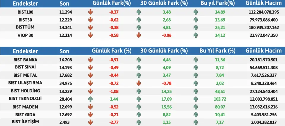 "Haftanın son işlem gününde küresel piyasalarda yatay seyir izlendi. Borsa İstanbul tarafında ise önceki gün yaşanan sınırlı negatif kapanış sonrasında düzeltme hareketi derinleşerek negatif kapanış yaşandı. BIST100 endeksi 11.340 puandan açılış yaparak günü %0,37 değer kaybıyla 11.294 puanda tamamladı. 11.228 seviyesini test eden endeks, gün içi en yüksek 11.352 seviyesini gördü. BIST100 işlem hacmi ise 30 günlük ortalama hacim olan 127.4 milyar TL altında 112.2 milyar TL seviyesinde gerçekleşti.