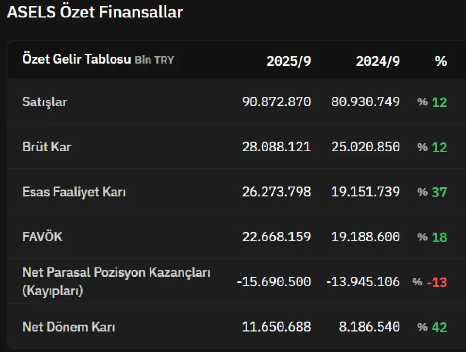 Net kar tahminlerin üzerinde. Aselsan, 3Ç25'te beklentilerin üzerinde (İş Yatırım: 2,93 milyar TL; Piyasa: 3,07 milyar TL), yıllık bazda %78 artışla 4,77 milyar TL net kar rakamı açıkladı. Daha yüksek ertelenmiş vergi giderlerine rağmen operasyonel performanstaki iyileşme ve daha düşük parasal kayıplar net kar rakamındaki yıllık bazda büyümenin ana sebepleri olarak öne çıkıyor. Beklentimizin altında parasal kayıplar, net kar tahminimizdeki sapmanın nedenini oluşturuyor. Aselsan, 3Ç25'te yıllık bazda %14 artışla beklentilere paralel olarak 33,1 milyar TL net satış geliri elde ederken (İş Yatırım: 32.6 milyar TL; Piyasa: 32.3 milyar TL), yurtdışı gelirlerin payı 9A24'teki %12,3'ten 9A25'te %9,4'e geriledi. Brüt kar marjı 3Ç25'te yıllık bazda yatay seyrederek %29,0 olarak gerçekleşirken, faaliyet giderleri/satış oranı 1,4 yüzde puan düşerek %8,3'e geriledi. FAVÖK, 3Ç25'te beklentilere paralel (İş Yatırım: 7,91 milyar TL; Piyasa: 7,90 milyar TL) yıllık bazda %25 artışla 8,19 milyar TL olarak kaydedilirken FAVÖK marjı yıllık bazda 2,1 puan artışla %24,7'e yükseldi.Yüksek yatırım harcamaları nedeniyle negatif SNA. Serbest nakit akımı, artan yatırım harcamalarına rağmen (3Ç25: 10,9 milyar TL, 3Ç24: 7,49 milyar TL) işletme faaliyetlerinden sağlanan nakit akışındaki yükseliş sayesinde (3Ç25: 9,44 milyar TL, 3Ç24: 3,96 milyar TL) 3Ç24'teki negatif 3,53 milyar TL'den 3Ç25'te negatif 1,45 milyar TL'ye iyileşti. Aselsan'ın 2Ç25 sonundaki 22,6 milyar TL net borç pozisyonu 3Ç25 sonunda 23,8 milyar TL'ye yükseldi.