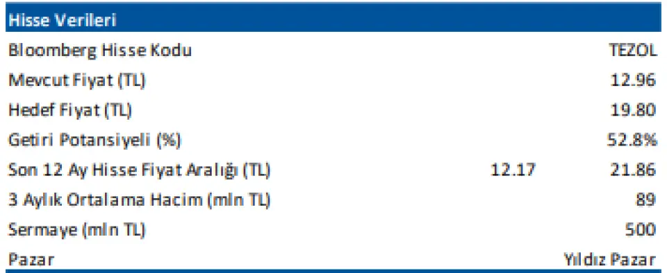 Şirketin finansal tablolarını değerlendiren Deniz Yatırım hisseye 19,80 TL hedef fiyat verdi. TEZOL borsada 12 TL civarı fiyatlardan işlem görüyor. Bu hedef ile hissede beklenen kazanç oranı ise %52,8 oluyor.