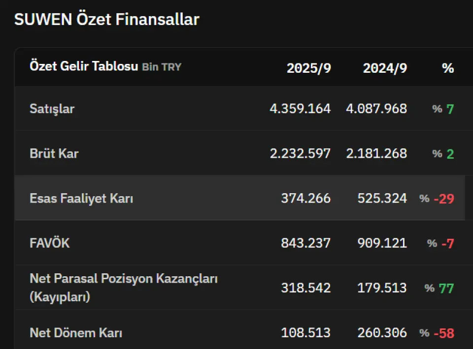 SUWEN bu yıl 3. çeyrek bilançosunda 108.513.000 TL kar açıkladı. Şirket geçen yıl aynı dönemde 260.306.000 TL kar açıklamıştı. Gedik Yatırım şirketin finansal rakamlarını değerlendirdi. Hissenin yıl başından bu yana BIST-100 Endeksi’nin %18,1 altında performans göstermiş olduğunu açıklayan kurum hisseye hedef fiyat vermedi.