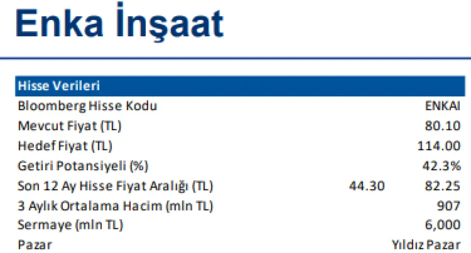 Deniz yatırım Enka İnşaat (ENKAI) – AL – Hedef Fiyat: 114,00 TL