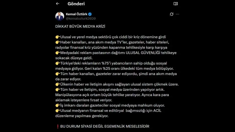 X platformunda yapılan paylaşımda gazeteci Kemal Öztürk, medya sektörünün içinde bulunduğu finansal dar boğazın sadece bir ekonomik kriz değil, aynı zamanda bir milli güvenlik sorunu olduğunu dile getirdi. Öztürk, reklam pastasının adaletsiz dağılımı nedeniyle ulusal medya sisteminin çöküşün eşiğinde olduğu konusunda kritik uyarılarda bulundu.