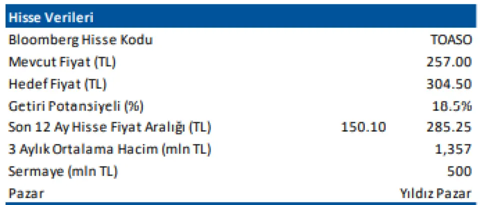 TOASO hissesinde ise hedef fiyat 304,50 TL ve kazanç potansiyeli de %18,5 oranında bekleniyor.