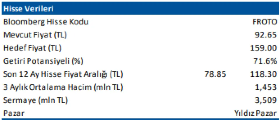Deniz Yatırım son ihracat verileri ışığında FROTO hissesinde 159 TL hedef fiyat beklentisi içinde. Hissede getiri potansiyeli bu fiyat ile %71,6 oranında.
