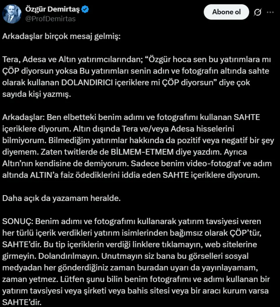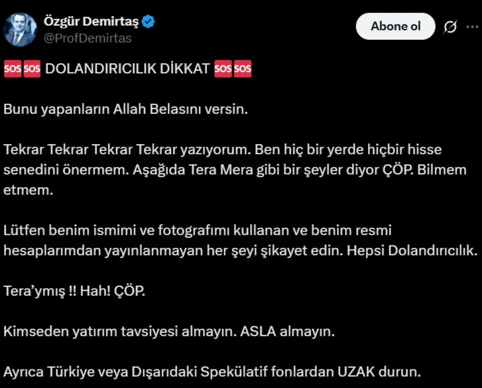 Prof. Dr. Özgür Demirtaş, X hesabından yaptığı ilk uyarıda, "Bunu yapanların Allah belasını versin. Ben hiçbir yerde hisse senedi önermem. Aşağıdaki gibi şeyler ÇÖP, dolandırıcılık" ifadelerini kullanmıştı. Ekonomist, paylaşımında özellikle "Tera Mera" benzeri isimleri hedef alarak, bu tür içeriklerin kesinlikle sahte olduğunu ve dolandırıcılık amacı taşıdığını vurgulamıştı.