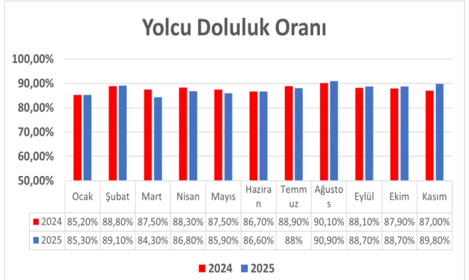 Yılın ilk 11 ayında iç hat yolcu doluluk oranı 0,2 puanlık artışla %91,9 olurken, dış hatlarda 0,2 puanlık düşüşle %87,3’e geriledi. İç hatlarda AKK %13 artış gösterirken, dış hatlarda %18’lik büyüme kaydedildi.
