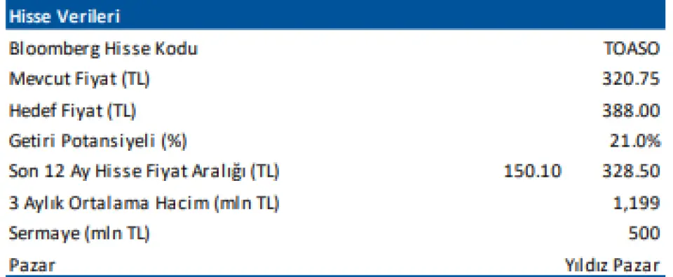 ■ Tofaş Otomobil için 12-aylık hedef fiyatımız 388,00 TL, önerimiz AL yönünde. Hisse, yıl başından itibaren BIST 100 Endeksi’nin %7,4 üzerinde performans göstermiştir. Geriye dönük 12 aylık verilere göre hisse 57,7x F/K ve 33,0x FD/FAVÖK çarpanlarıyla işlem görmektedir.