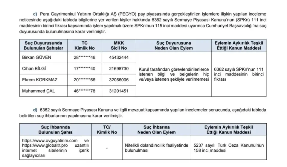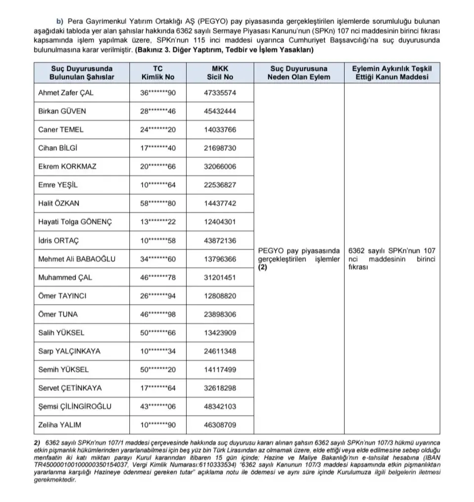 - "b) Pera Gayrı̇menkul Yatırım Ortaklığı AŞ (PEGYO) pay piyasasında gerçekleştirilen işlemlerde sorumluluğu bulunan aşağıdaki tabloda yer alan şahıslar hakkında 6362 sayılı Sermaye Piyasası Kanunu’nun (SPKn) 107 nci maddesinin birinci fıkrası kapsamında işlem yapılmak üzere, SPKn’nun 115 inci maddesi uyarınca Cumhuriyet Başsavcılığı’na suç duyurusunda bulunulmasına karar verilmiştir. (Bakınız 3. Diğer Yaptırım, Tedbir ve İşlem Yasakları)"