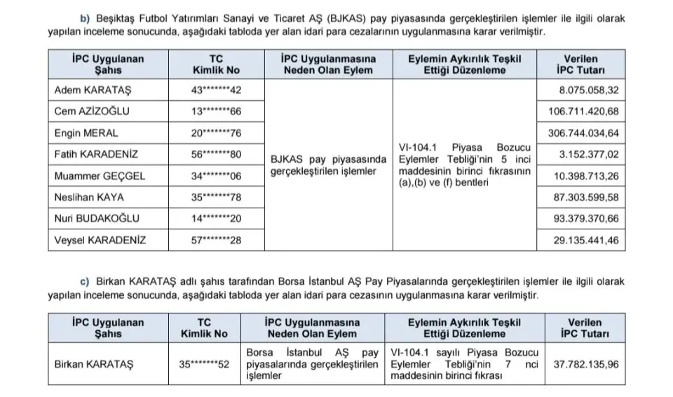 - "b) Beşiktaş Futbol Yatırımları Sanayi ve Ticaret AŞ (BJKAS) pay piyasasında gerçekleştirilen işlemler ile ilgili olarak yapılan inceleme sonucunda, aşağıdaki tabloda yer alan idari para cezalarının uygulanmasına karar verilmiştir."