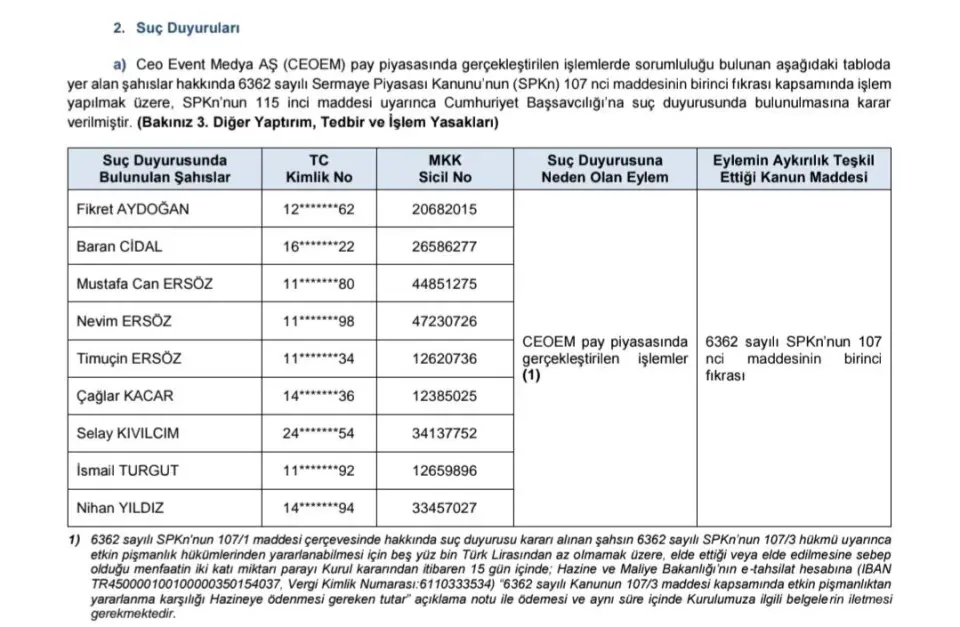 - "a) Ceo Event Medya AŞ (CEOEM) pay piyasasında gerçekleştirilen işlemlerde sorumluluğu bulunan aşağıdaki tabloda yer alan şahıslar hakkında 6362 sayılı Sermaye Piyasası Kanunu’nun (SPKn) 107 nci maddesinin birinci fıkrası kapsamında işlem yapılmak üzere, SPKn’nun 115 inci maddesi uyarınca Cumhuriyet Başsavcılığı’na suç duyurusunda bulunulmasına karar verilmiştir. (Bakınız 3. Diğer Yaptırım, Tedbir ve İşlem Yasakları)"