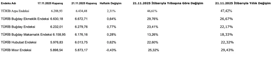 TÜRİB Arpa Endeksi: 17.11.2025 6.288,93 seviyesinde, 21.11.2025 günü ise 6.434,48 seviyesinde kapanmıştır. Haftalık değişim %2,31, yıllık değişim %47,42 olmuştur.TÜRİB Buğday Ekmeklik Endeksi: 17.11.2025 6.630,18 seviyesinde, 21.11.2025 günü ise 6.672,71 seviyesinde kapanmıştır. Haftalık değişim %0,64, yıllık değişim %26,67 olmuştur.