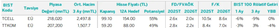 TCELL hissesi için tespit edilen hedef fiyat 154 TL ve beklenen kazanç %55 oranında. Kurum TTKOM için 88 TL hedef fiyat tespit etti ve hisseden %49 kazanç bekliyor.