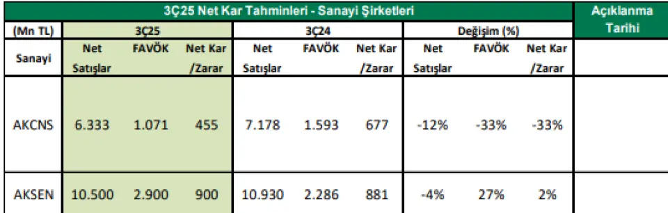 AKCNS: Şirketin satış gelirlerinin 3Ç25’te enflasyon katsayısı uygulanmış verilere göre yıllık bazda yaklaşık %12 oranında azalış göstermiş olabileceğini tahmin ediyoruz. Satış gelirlerindeki azalış beklentimize rağmen FAVÖK marjında iyileşme olacağını düşünmekteyiz.