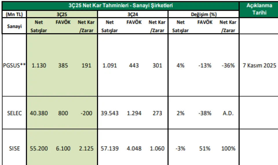 PGSUS: Güçlü seyreden yolcu trafiği v e artan kapasiteye rağmen jeopolitik gelişmeler v e rekabetçi koşulların bilet fiyatları üzerindeki negatif etkisinden kaynaklı olarak Pegasus için 3Ç25’te yıllık %3,5’lik satış geliri büyümesi bekliyoruz. Yakıt fiyatları, maliyetler üzerinde baskı yaratmasa bile artan personel giderleri operasyonel karlılık üzerinde baskı oluşturmaya devam ediyor. Bu çeyrekte marjlarda daralma ve net kar rakamında düşüş öngörüyoruz.SELEC: İlaç fiyatlarında uygulanan dönemsel Avro değerinde güncelleme olmaması v e devam eden yüksek personel maliyetlerinin, finansallar üzerinde baskı yaratmaya devam edeceğini düşünüyoruz.