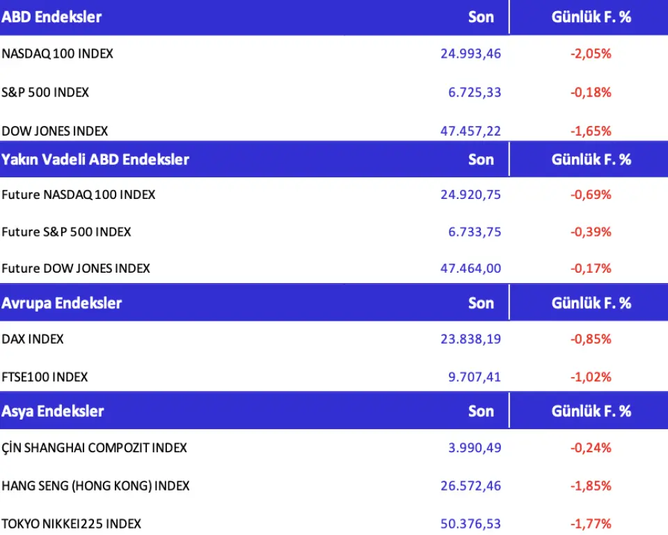 ABD borsalarında satış baskısı devam ederken, teknoloji hisseleri özellikle yapay zekâ değerlemelerine dair endişeler ve Fed’in faiz indirimlerini erteleyebileceği beklentisiyle geriledi. S&P 500 ve Nasdaq vadelileri hafif düşerken, yatırımcılar riskten kaçınarak defansif sektörlere yöneldi. Fed yetkililerinin temkinli açıklamaları, Aralık’ta faiz indirimi ihtimalini %50’nin altına düşürdü ve yaklaşan ekonomik veriler piyasaların yönünü belirleyecek.