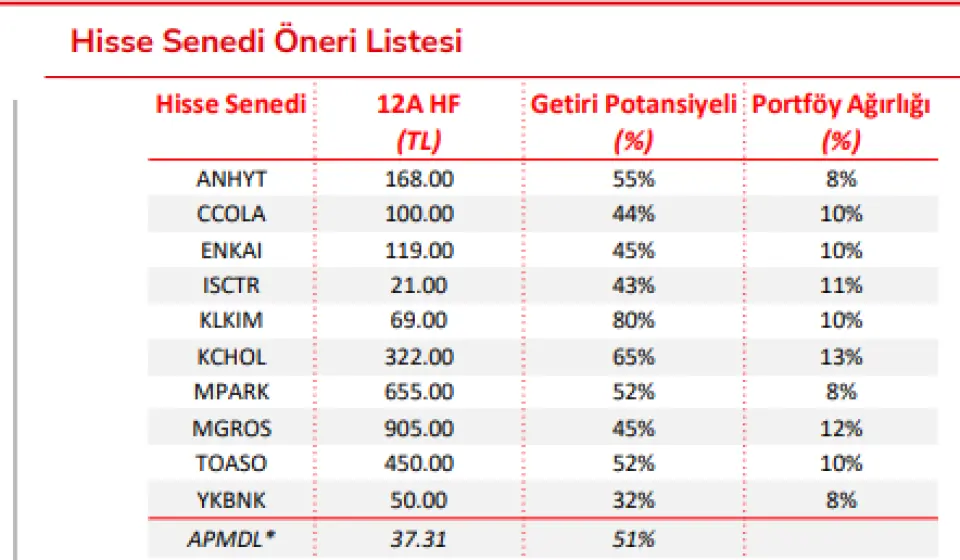 Özellikle 2026 yılının ilk yarısı için öneri listemizde finans ve hizmet sektörlerine daha fazla odaklanmayı tercih ediyoruz. Bu nedenle, bu güncellemeler ve Otokar'ın listemizden çıkarılmasının ardından, yenilenmiş MPS listemizde Anadolu Hayat, Coca-Cola İçecek, Enka İnşaat, İş Bankası C, Kalekim, Koç Holding, MLP Care, Migros, Tofaş, ve Yapı Kredi Bankası hisseleri yer almaktadır.