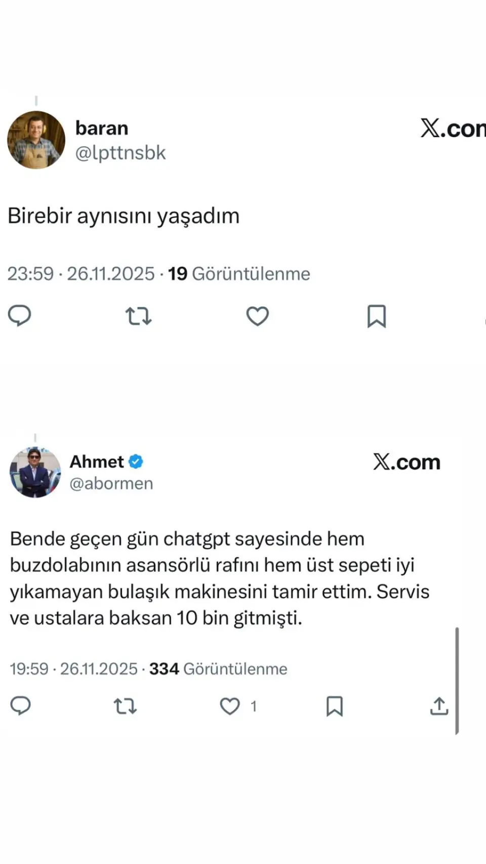 Buzdolabı ve bulaşık makinesini ChatGPT sayesinde çözdüğünü yazan bir kişi de, aynı sorunlar için servis ve usta çağırsa 10 bin TL harcayacağını iddia etti. Vatandaş, buzdolabının asansörlü rafını hem de üst sepeti iyi yıkamayan bulaşık makinesini yapay zekayla tamir ettiğini belirtti.