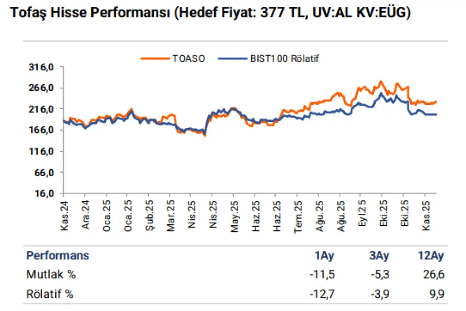 ▪ Tofaş (TOASO): Kasım 2025’te şirketin otomobil satışları, geçen yılın aynı dönemine göre %51,2 azalarak 4.701 adede geriledi. Hafif ticari araç satışları ise aynı dönemde %15,3 artışla 4.676 adede yükseldi. Böylece toplam araç satışları kasım ayında %31,5 azalarak 9.377 adet olarak gerçekleşti. Ocak–Kasım 2025 döneminde şirketin toplam satışları, geçen yılın aynı dönemine kıyasla %15,5 azalarak 107.335 adet oldu. Şirketin toplam otomotiv pazarı içindeki payı bu dönemde yıllık 4,3 puan düşüşle %7,1 seviyesine geriledi. Stellantis Otomotiv ise bu dönemde yıllık %8,4 artışla 15.282 adet otomobil ve yıllık %13,7 artışla 8.112 adet hafif ticari araç satışı gerçekleştirirken, yılbaşından bu yana toplam araç satışları yıllık %18,4 artışla 202.356 adet oldu. Stellantis’in toplam otomotiv pazarı içindeki payı ise kasımda yıllık 0,1 puan artışla %17,6’ya yükseldi. FCA+PSA’nın pazar payına bakıldığında yıllık 4,2 puan azalışla %24,6’ya gerilediği görüldü. Tofaş’ın, 2025 yıl sonu satış adedi beklentisinin 350–370 bin adet (FCA+PSA) olduğunu hatırlatalım.