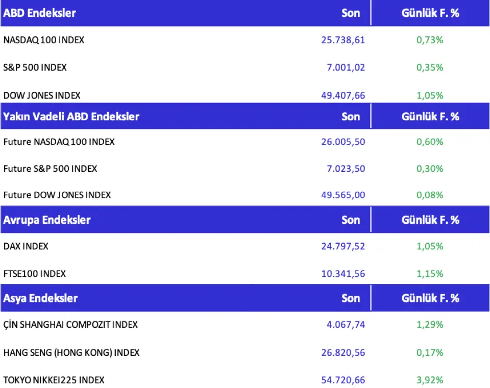 ABD piyasalarında teknoloji hisselerindeki sert satışlar endeksleri baskıladı. Yapay zekâ yatırımlarına yönelik endişeler, yüksek değerleme kaygıları ve ocakta artan işten çıkarmalar satışları hızlandırırken S&P 500 geriledi, Nasdaq 100 nisan ayından bu yana en sert düşüşünü yaşadı. Fed başkanlığı için adı geçen Kevin Warsh'a ilişkin belirsizlikler güvenli liman talebini artırdı, 10 yıllık ABD tahvil faizi yüzde 4,18'e indi.