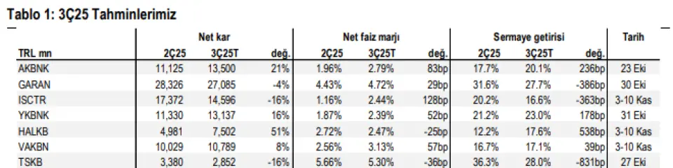 Takip ettiğimiz bankaların toplam net karının 3Ç25’te çeyreklik bazda %3, yıllık olarak %62 artacağını tahmin ediyoruz. Akbank, Yapı Kredi, Halkbank ve Vakıfbank’ın 3Ç25’te çeyreklik bazda net kar artışı göstereceğini düşünüyoruz. Garanti’nin net karında çeyreklik hafif bir daralma beklememize rağmen, 3Ç25’te de nominal olarak açık ara farkla en yüksek net karı açıklayan banka konumunda kalacağını düşünüyoruz.