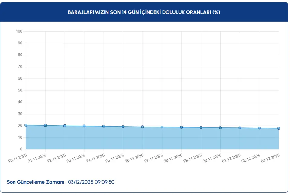 Böylece 3 Aralık 2025 tarihinde İstanbul Su ve Kanalizasyon İdaresi (İSKİ) tarafından açıklanan verilere göre ortalama baraj doluluk oranı %17,86 olarak açıklandı.