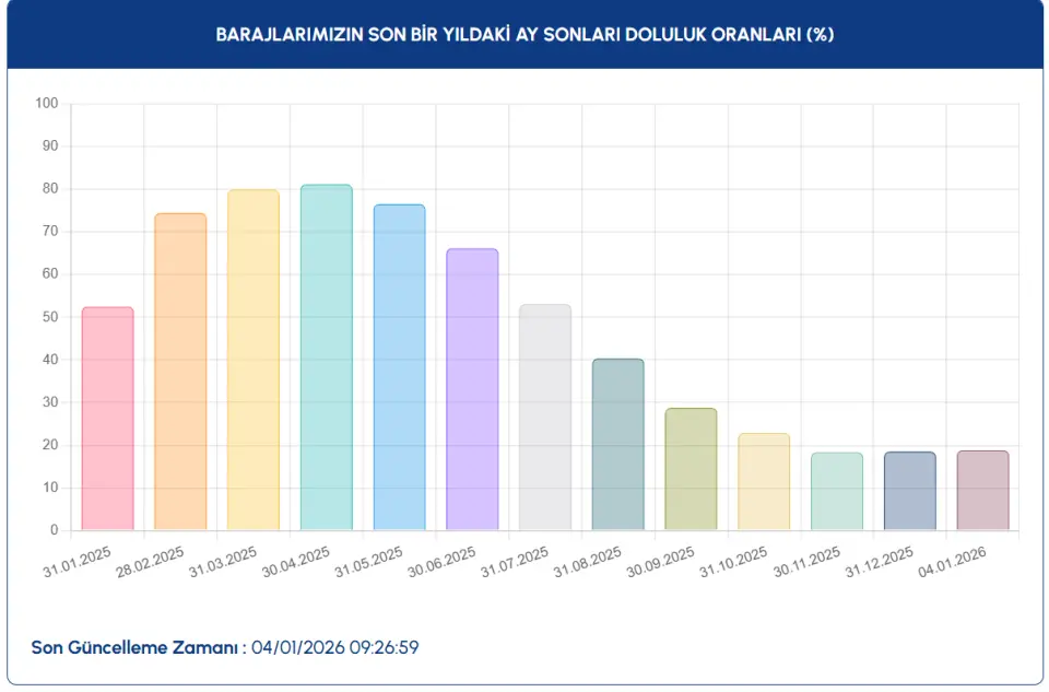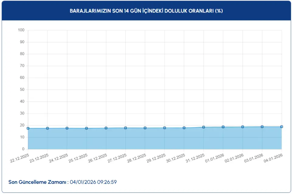 Böylece 4 Ocak 2026 tarihinde İstanbul Su ve Kanalizasyon İdaresi (İSKİ) tarafından açıklanan verilere göre ortalama baraj doluluk oranı %18.88 olarak açıklandı.
